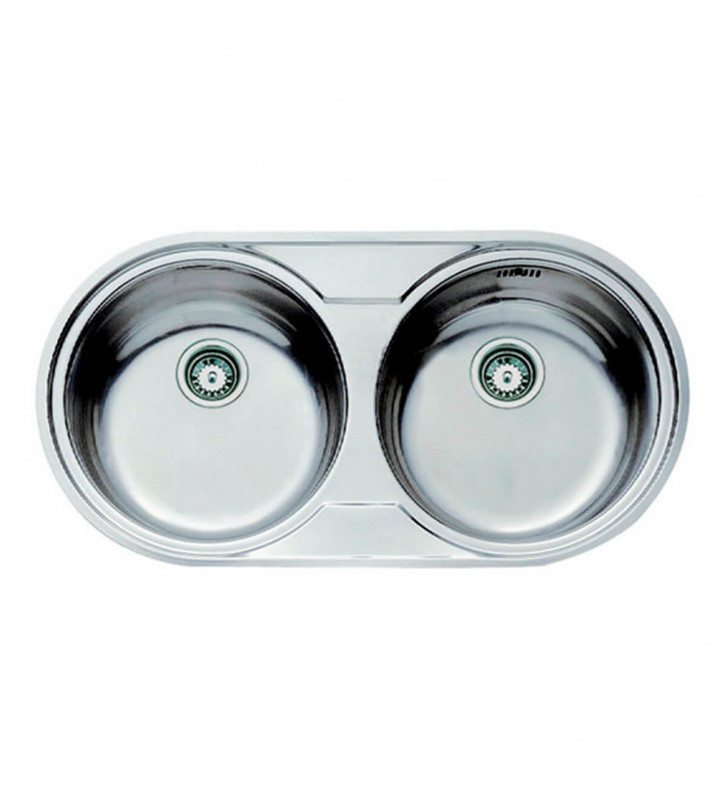 Fregadero de dos cubetas. Acero inoxidable 18/10. Válvula canasta 3 ½”. Profundidad de las cubetas 140 mm. Mueble de 80 cm. Medidas de la cubeta: Ø360 mm. Medidas (ancho x fondo): 840 x 440 mm.